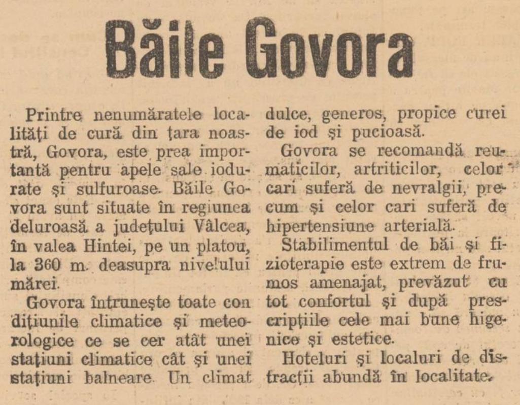 Iată cum era prezentat Băile Govora în anul 1929, în ziarul „Mișcarea”: „Printre nenumăratele localități de cură din țara noastră, Govora stă între cele dintâi, datorită apelor sale iodurate și sulfuroase. Aceste ape au fost descoperite încă de la 1880, cu ocazia explorărilor pentru căutarea petrolului. Băile Govora sunt situate în regiunea deluroasă a județului Vâlcea, în valea Hlinței, pe un admirabil platou, înconjurate de păduri seculare de stejar și fag, și plantațiuni de pini și molifți. Un climat dulce, generos, propice curei de iod și pucioasă, lipsit de curenți și umezeală, favorizează stațiunea. Stabilimentul de băi este un adevărat giuvaer, cu instalațiuni moderne, nespus de curat, și cu o funcționare uimitor de precisă. Există aci un vast Institut de fizioterapie, pentru cu personal educat și medici de mâna întâi (…), numeroase hoteluri și vile de prim rang, cu peste 2.500 de camere, toate confortabile și la prețuri modeste. Tot aci au fost clădite sau închiriate sanatorii pentru militari, ceferiști, pentru casa muncii etc. Restaurante de toate clasele stau la îndemâna fiecăruia. Viața la Govora este extrem de ieftină, piața fiind bogat alimentată de numeroase sate vecine. Distracții numeroase și inteligent organizate, sunt deasemeni o specialitate a localității noastre în timpul marelui sezon, cu serate dansante, concerte, serbări câmpenești, bătăi de flori, teatru etc.”