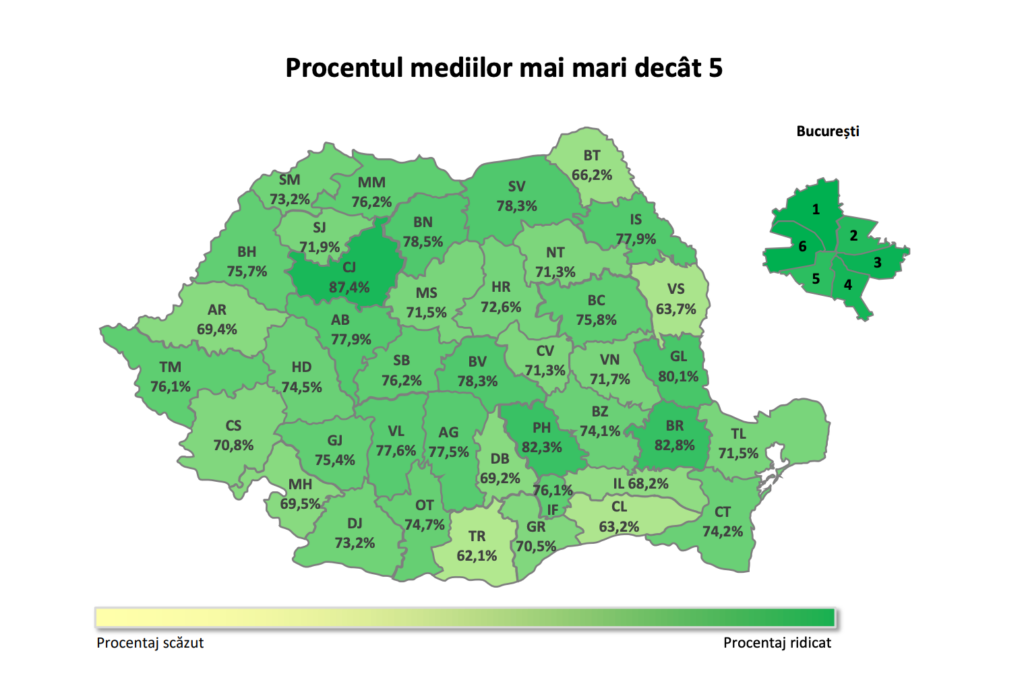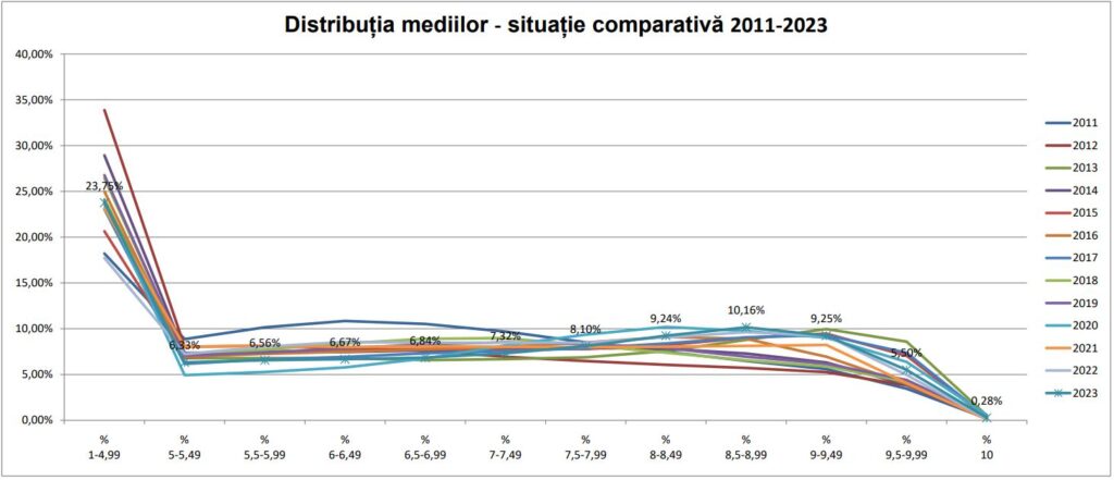 Ministerul Educației a anunțat că peste 76% dintre elevii care au susținut Evaluarea Națională în 2023 au obținut medii peste 5, conform unui comunicat de presă emis astăzi. Acest procent reprezintă al treilea cel mai mare rezultat în ultimii 6 ani.