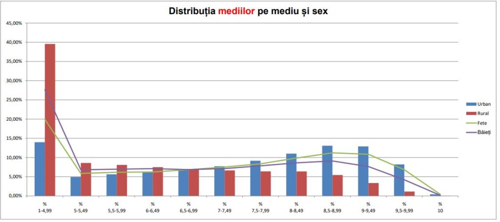 În graficul de mai jos se poate observa cum majoritatea notelor sub 5 aparțin elevilor din mediul rural. Diferența dintre notele situate între 1 și 4,99 este de la cer la pământ, comparând mediul rural și urban.