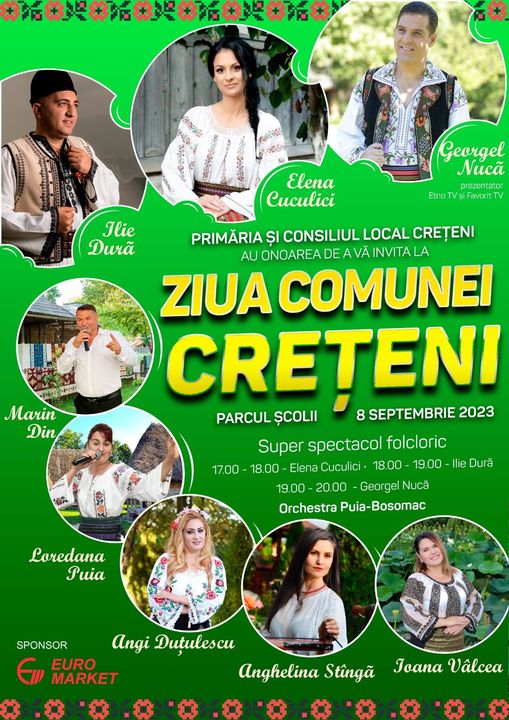 Spectacolul va debuta la ora 16:00 și se va încheia seara, oferind participanților momente pline de bucurie și distracție. „Cu ocazia acestei aniversări avem bucuria de a vă anunța organizarea unui spectacol folcloric care se va desfășura în parcul din curtea Școlii Gimnaziale Crețeni, începând cu ora 16:00. Pe scenă vor urca interpreți de valoare ai muzicii populare românești. Vă așteptăm cu mult drag, în număr cât mai mare pentru a ne bucura împreună de muzică bună”, spune primarul localității Crețeni, Constantin Catrina.