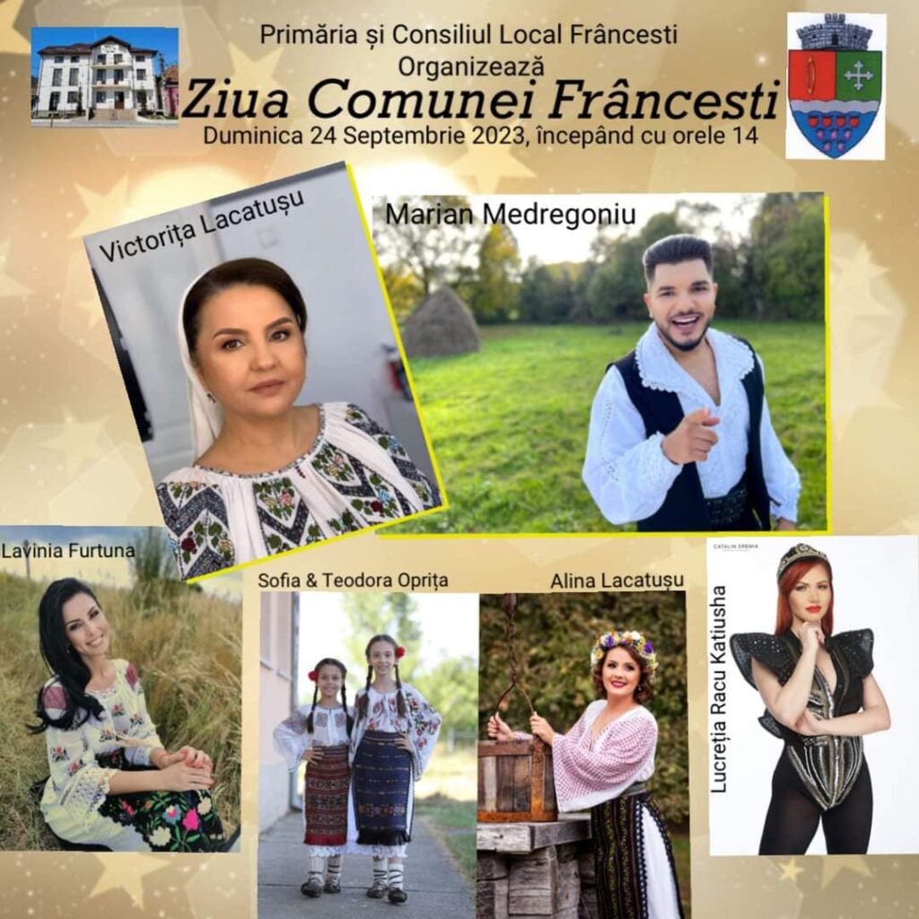 „Duminică, 24 septembrie 2023, vă invităm cu drag la „Ziua Comunei Frâncești”. Vor fi premiate cuplurile care au împlinit 50 de ani de căsătorie și elevii care au obținut rezultate deosebite la examenul de capacitate. Ziua va continua cu un program artistic și se va încheia cu un foc de artificii. Vă așteptăm cu mare drag!” a precizat primarul localității, Daniel Paraschiv.