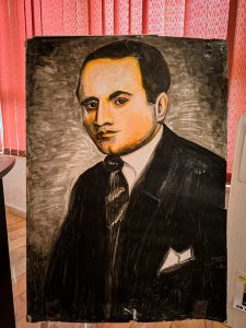Într-un colț al sălii, o fotografie mare a scriitorului privea parcă întreaga adunare, ca o prezență discretă, dar vie.